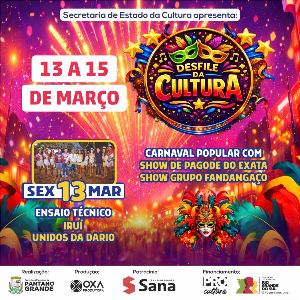 No dia 13 de março, sexta-feira, ocorrerá um ensaio técnico com Iruí Unidos da Dario, seguido de uma programação musical com show de Pagode do Exata e Grupo Fandangaço. O evento tem como objetivo valorizar artistas, fortalecer a cultura regional e proporcionar momentos de alegria para toda a comunidade, sendo financiado pelo PRO-CULTURA. Mais informações […]